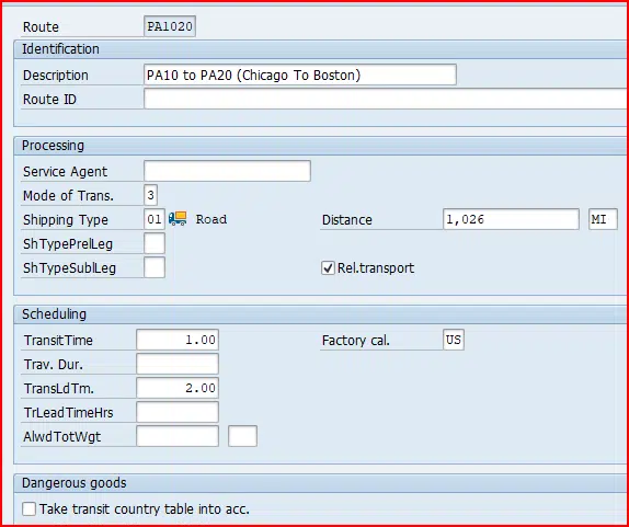 First we will configure a route to use for the transportation from plant PA10 to plant PA20