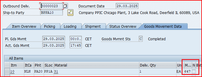 - Transit time is 1 calendar day so GR date & time will be 08.10.2024 15:21:45 (Receiving plant PA20 is in Boston so 1 hr. ahead from Chicago Plant time zone)