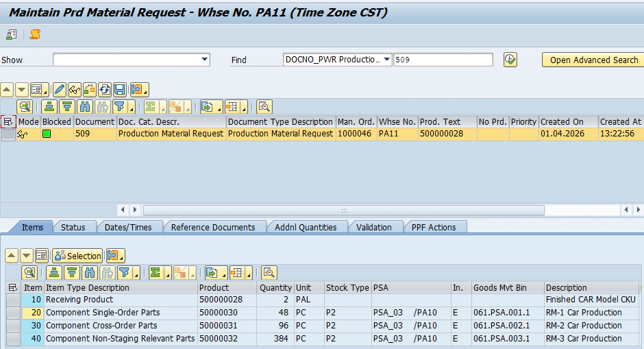 /SCWM/STAGE. For example, if a report is run on 23.04.2026, only orders with requirement dates on or before that timestamp (e.g., 02.04.2026) are selected. - PMR Status: Only PMRs with the status “DMC Production Order = 1 Released” are eligible. In this context, “1” is the technical value representing the “Released” status. This prevents the warehouse from staging materials for orders that are still in the planning or “Created” phase.