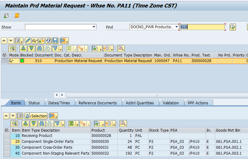 - Production Supply Area (PSA): The physical staging location on the shop floor. PSAs are defined in the Production Planning (PP) module and replicated to EWM to bridge the gap between planning and execution.