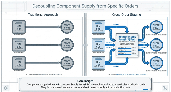 In high-volume manufacturing environments, the ability to decouple component supply from specific production orders is a strategic necessity for maintaining warehouse agility. Cross-Order Staging in SAP EWM facilitates this by replenishing components to the Production Supply Area (PSA) for multiple production orders simultaneously. Cross-order staging eliminates the 1:1 link between components and specific orders, creating a shared supply pool at the PSA available to any active production requirement.