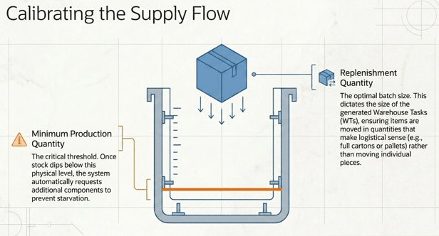 | Minimum Production Quantity in PSA | The “Trigger”: The threshold level. When PSA stock drops below this value, the system initiates new replenishment activity. |