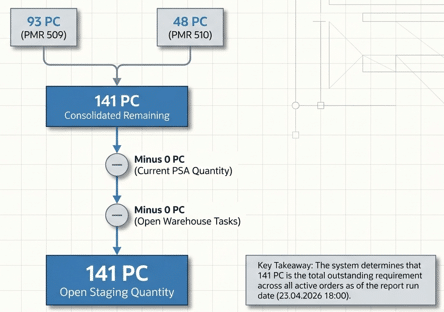 The “Open Staging Quantity” calculation is the central logic of the replenishment engine. It ensures that every Warehouse Task created is mathematically justified by the actual deficit at the PSA.