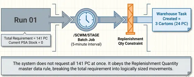 In a standard digital factory, the staging batch job is typically scheduled at frequent intervals (e.g., every 5 minutes). The system does not attempt to fulfill the entire 141 PC requirement in one massive movement; instead, it creates WTs in increments defined by the Replenishment Quantity (e.g., 3 CAR or 24 PC).