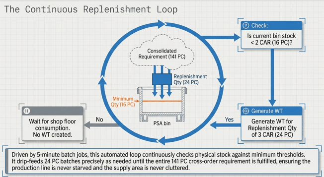 The system monitors the PSA bin continuously. If the Minimum Quantity is set to 2 CAR (16 PC), and the bin currently contains 16 PC, the system will not trigger a new WT. Only when consumption drives the stock level below 16 PC will the next report run trigger a new 24 PC Warehouse Task. This cycle repeats until the total consolidated requirement of 141 PC is fulfilled.