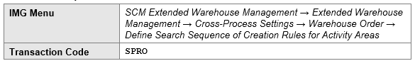 Here we define the search sequence of warehouse order creation rule for activity areas. We can assign one or more warehouse order creation rules to each defined activity area. These rules are processed during warehouse order creation for each activity area, according to the sequence defined.