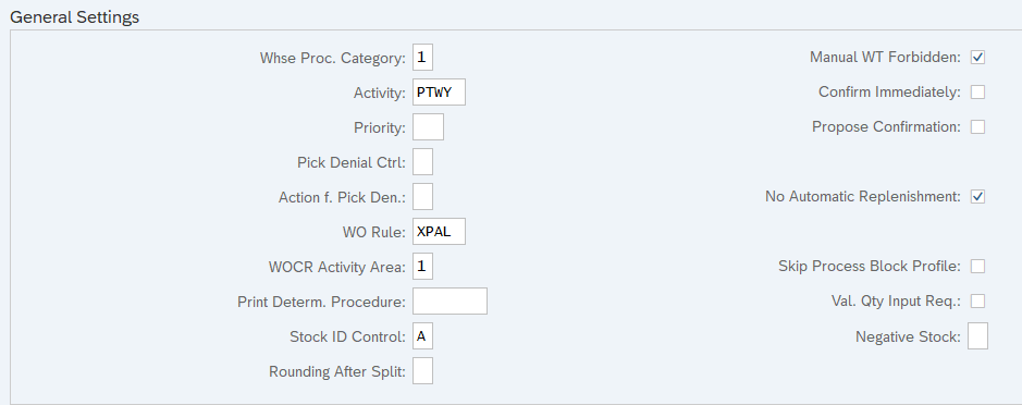 These settings are used to control the general behavior of a warehouse process type.